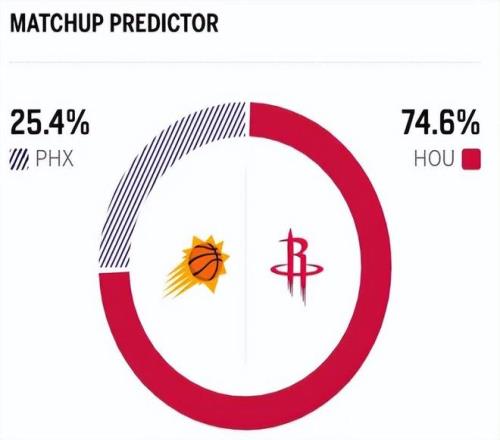 赛前,美媒ESPN对本场比赛进行了胜率预测,火箭队胜率依旧高达74.6%,占据绝对上风,太阳队胜率则仅有25.4%,还是不被看好。